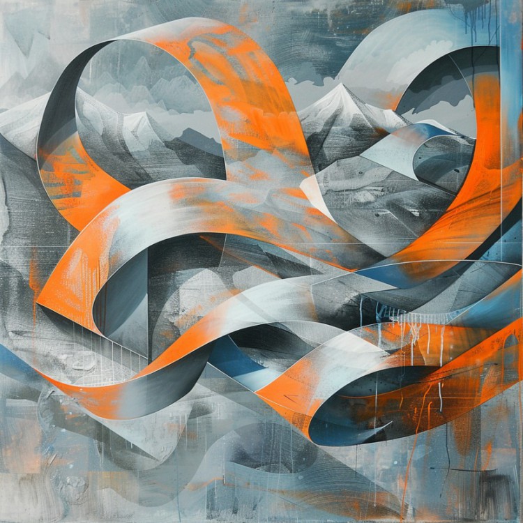 Het schilderij is een harmonieuze compositie waarin de majesteitelijke stilte en onbeweeglijke kracht van de bergen zijn omgezet in abstracte vormen en lijnen. De grijze tinten symboliseren de stabiele en onwrikbare basis van de bergen, terwijl de oranje accenten de laatste stralen van de zonsondergang vangen, die de toppen in een warm licht baden.