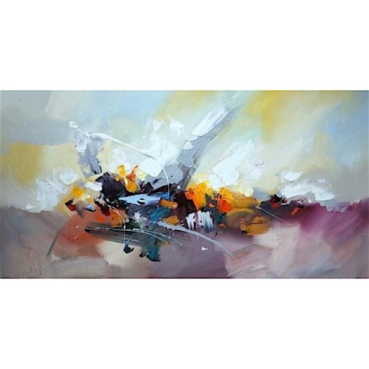 Nu te Koop - Kleurrijk dik geschilderd modern abstract schilderij met olieverf - kleur wit, oranje, geel en blauw. Gratis bij u thuis gelevert & 100% retour garantie.