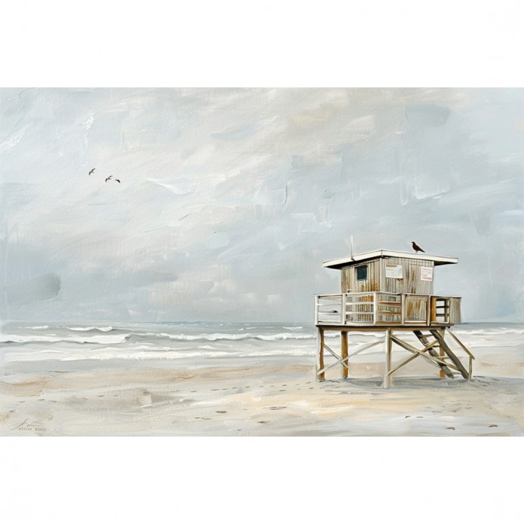 Het schilderij "Kustwacht Kunst" is een levendig olieverfschilderij dat de essentie van een zomerdag aan het strand vastlegt. Dit kunstwerk, dat het strandwachtstation in volle glorie toont, is een hommage aan de rustige maar cruciale wacht die deze helden van de kustlijn bieden.