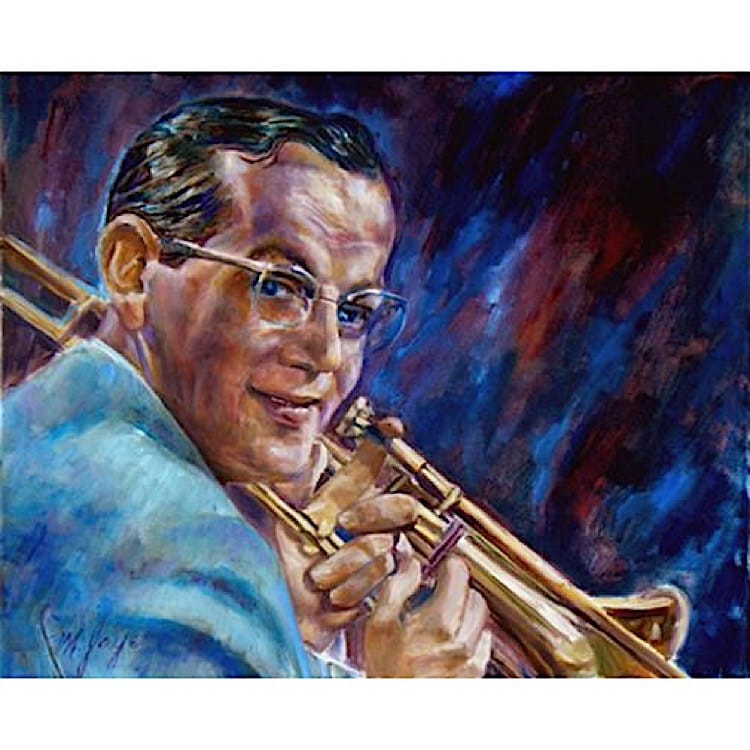 Olieverf schilderij kopen van Alton Glenn Miller geboren op 1 maart 1904. En is overleden bij een ongeval boven Het Kanaal, op 15 december 1944. Hij was een Amerikaanse jazztrombonist en bigbandleider.