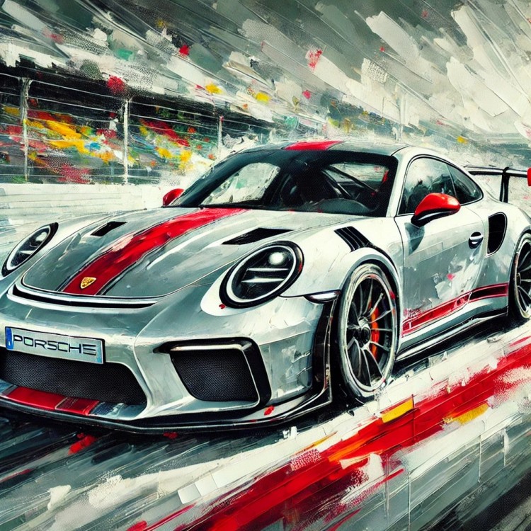 Dit olieverfschilderij van de Porsche GT3 RS is een meesterwerk dat de kracht en snelheid van deze iconische sportauto perfect vastlegt. Het schilderij toont de volledige auto op een racebaan, waarbij de metallic zilveren lak met rode accenten schitterend tot zijn recht komt. De achtergrond, met een onscherpe racebaan en dynamische penseelstreken, benadrukt de snelheid en beweging, terwijl de dikke olieverftextuur diepte en leven toevoegt.